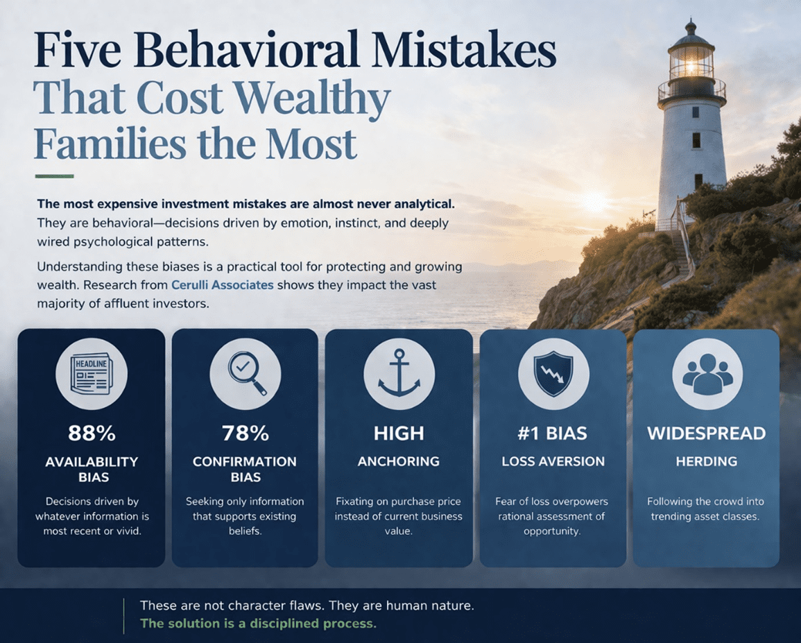 According to research from Cerulli Associates, the overwhelming majority of affluent investors exhibit behavioral biases that directly affect their investment outcomes. What follows are the five I encounter most frequently among the high-net-worth families I work with — each illustrated with a composite example drawn from the kinds of situations that arise in the $2 million to $25 million range.