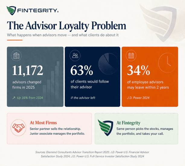What does this mean for you? If your portfolio is managed by a team rather than a specific person, the team will change. People will leave, retire, or be reassigned. Your account will be handed off again. J.D. Power found that 63% of investors would follow their advisor to a new firm if that advisor left. But if you do not have a specific advisor — if you have a team, a process, a service model — there is no one to follow. You simply start over with a new set of people who do not know your situation.